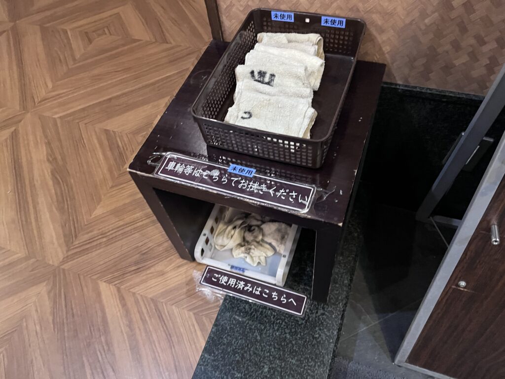 店内に入って印象的だったのは、スーツケースのキャスターを拭くためのタオルが用意されていたこと。